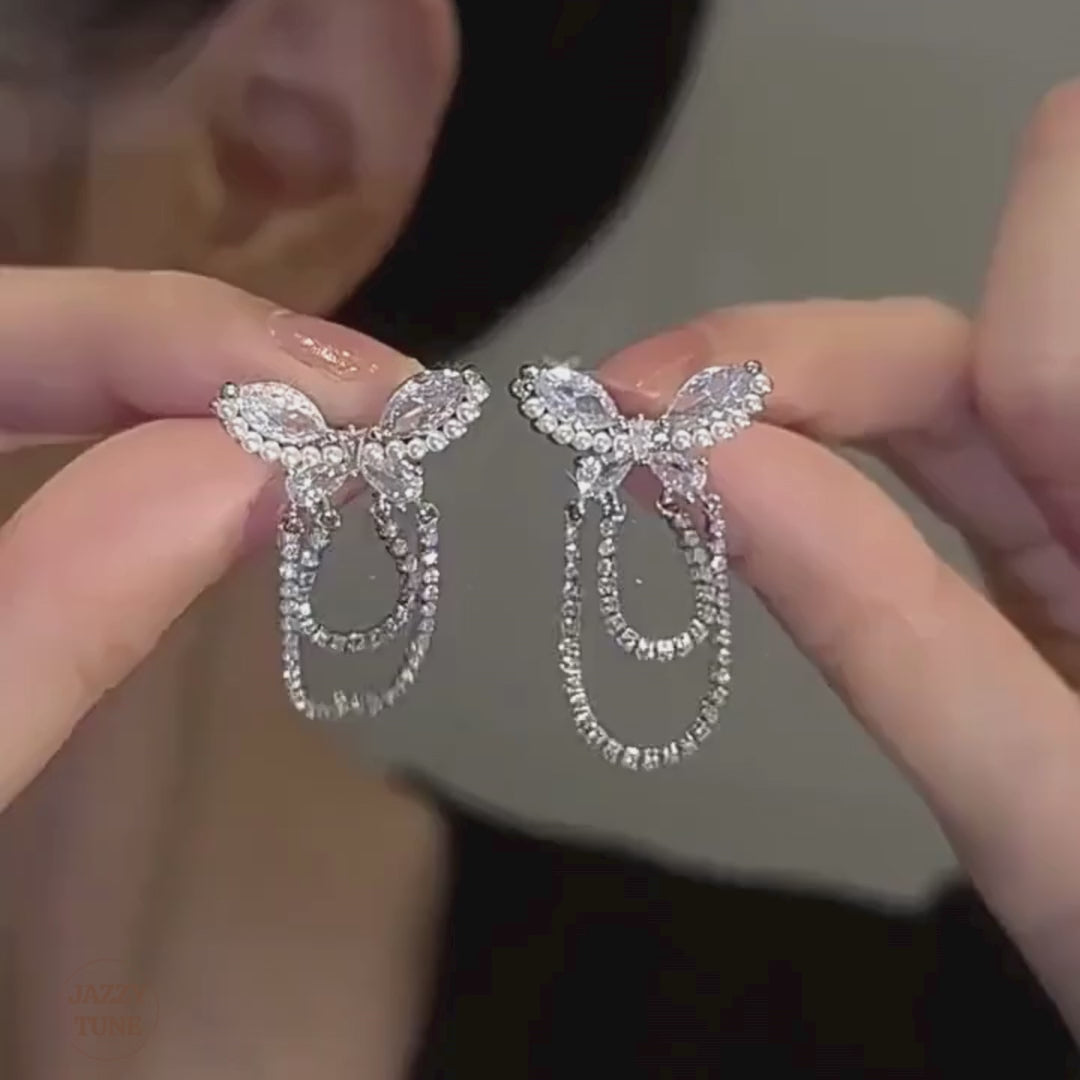 ✦ Shine with style and grace in these Sparkly Butterfly Tassel Drop Earrings! Embellished with rhinestones and two layers of chains, these earrings exude elegance and glamour. Perfect for any party or special occasion, they also make a beautiful bridesmaid gift. Made with hypoallergenic sterling silver, these earrings are perfect for all women, adding a feminine touch with a butterfly design.
